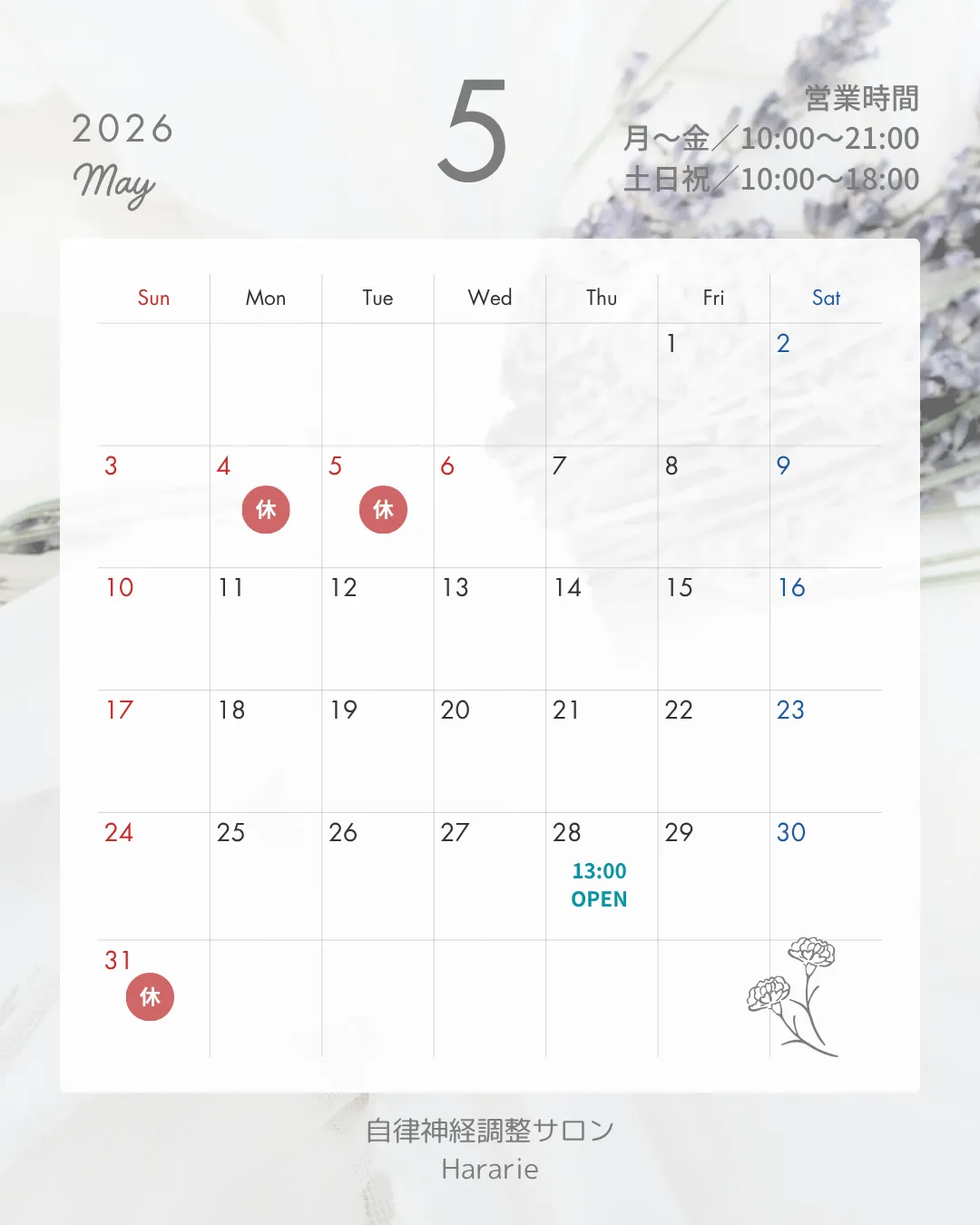 5月営業スケジュール/自律神経調整サロンHararie〜はらりえ〜